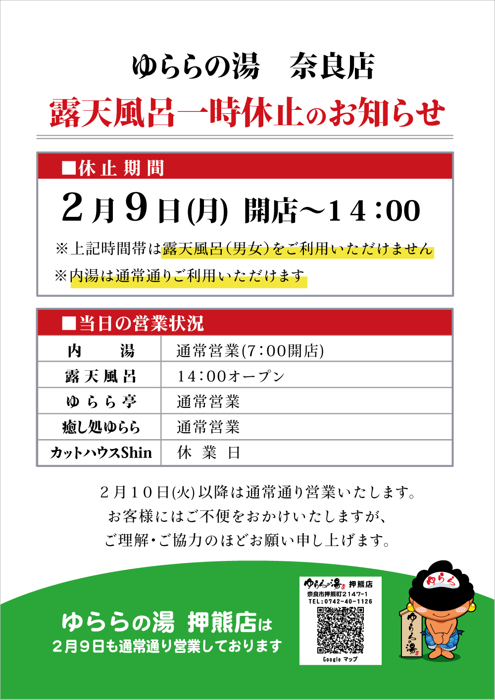 設備メンテナンスのため、奈良店の露天風呂を下記の通り一時的に休止させていただきます。