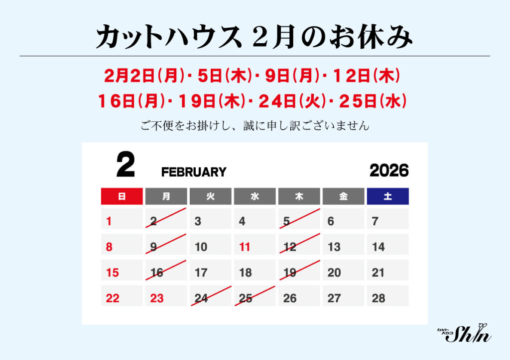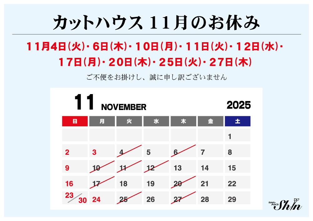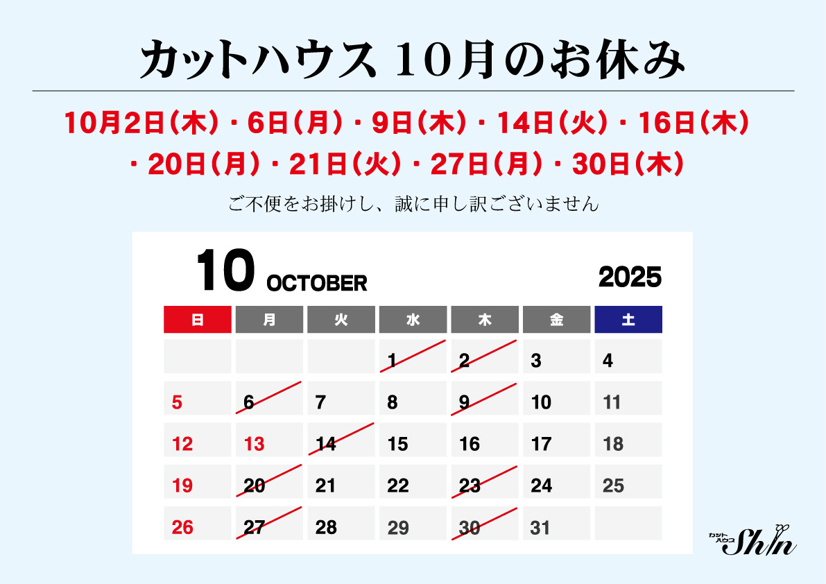 勝手ながらカットハウスは休業日を設けさせていただいております。