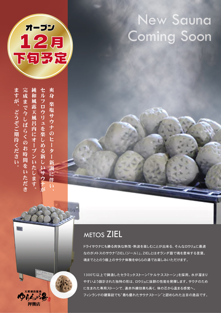 ヒーターの新調に伴い、セルフロウリュが楽しめるサウナを12月下旬頃オープン予定で準備を進めております。完成まで今しばらくのお時間をいただきますが、どうぞご期待ください。