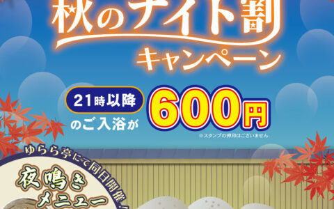 秋の夜長に温泉はいかが?21時からラストまで、ご入浴料金が600円♨️空が澄んで月が最も美しく見えるこの頃、夜の静けさと湯けむりの癒しをお楽しみください。 ※スタンプの押印はございません。 ※その他の特典・割引との併用は … 続きを読む 水・木限定 秋のナイト割キャンペーン