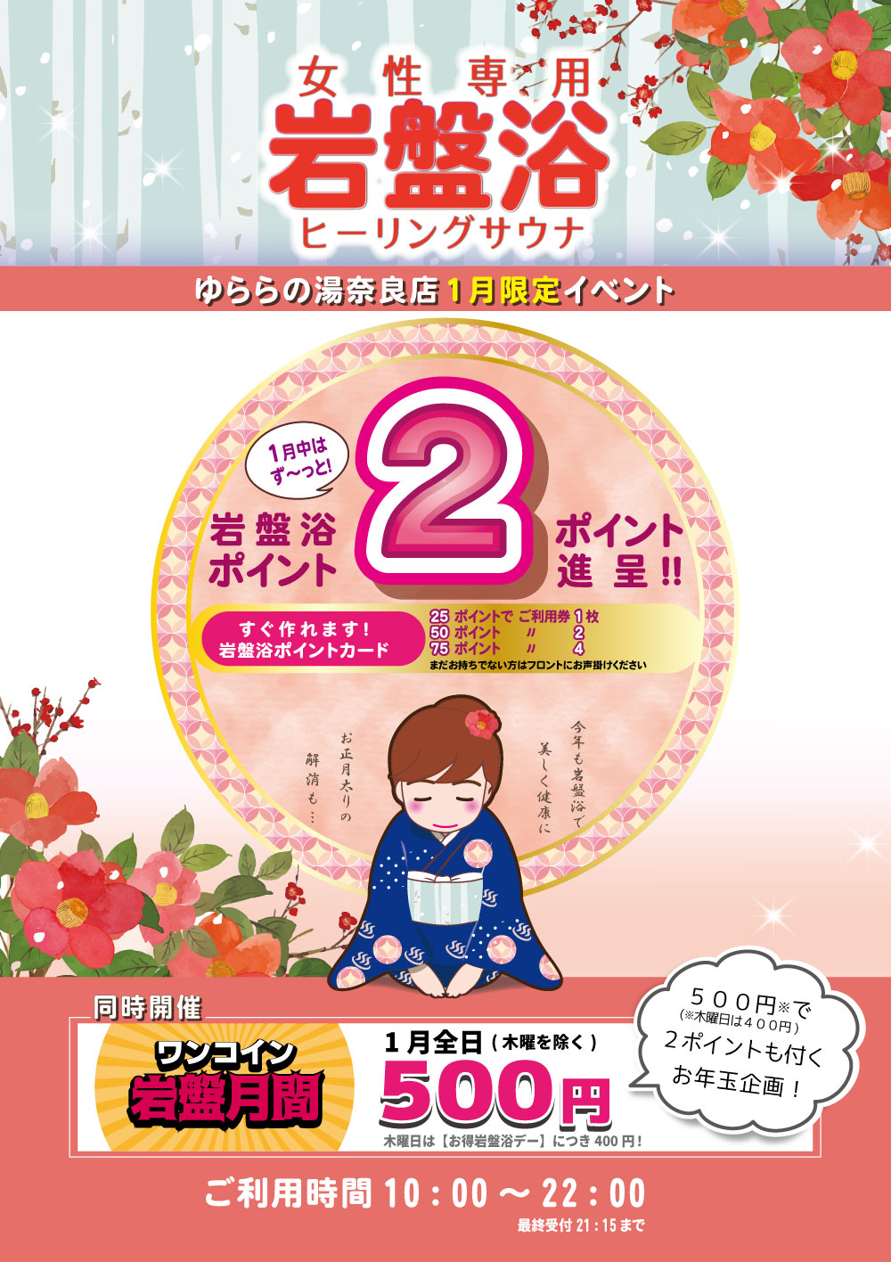 女性専用岩盤浴 1月全日2ポイント進呈!
