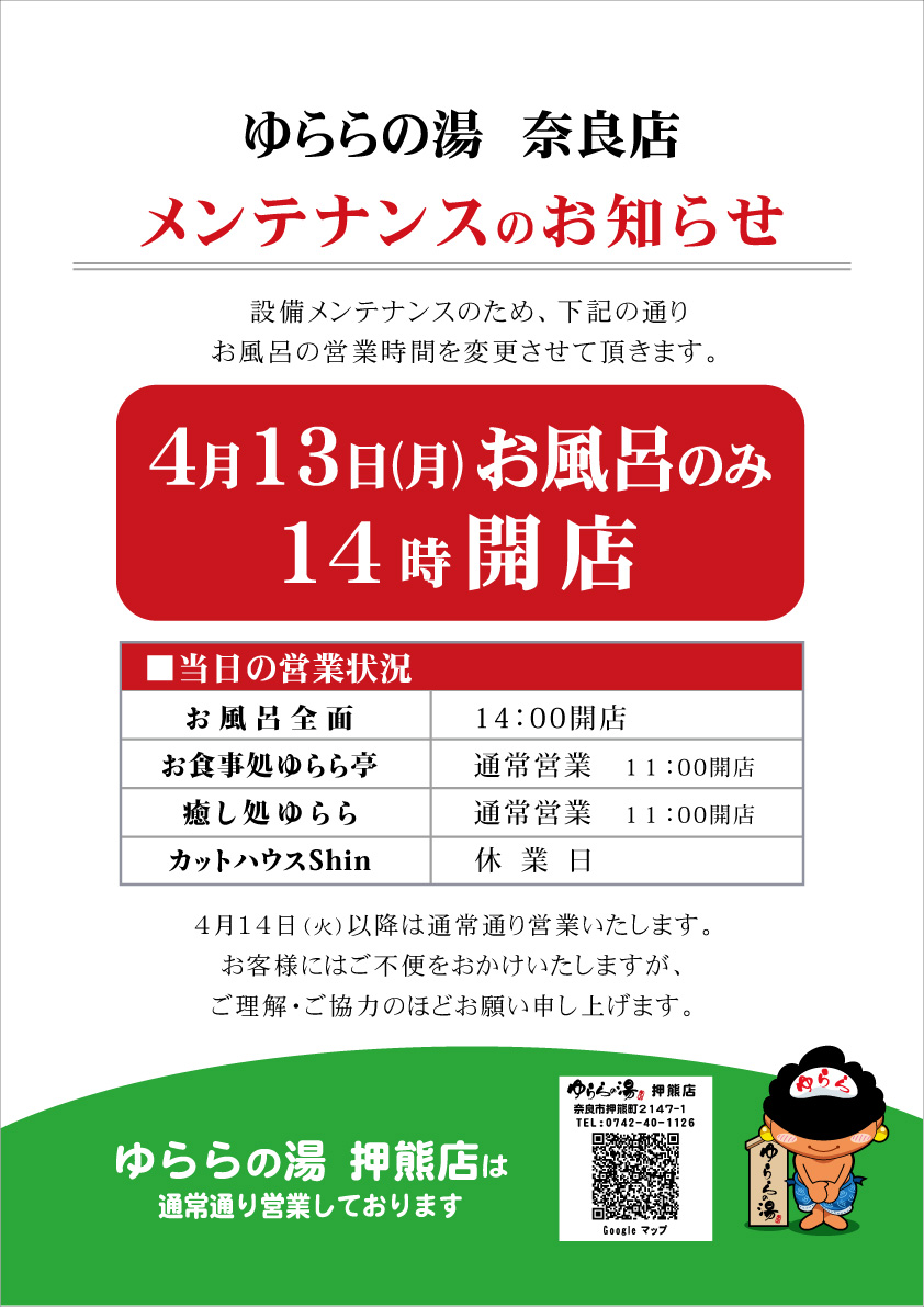 いつも天然湧出温泉ゆららの湯奈良店をご利用いただき誠にありがとうございます。