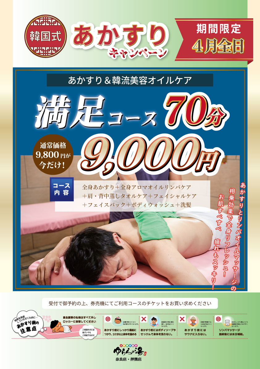 人気の高い韓国式あかすりの満足コース70分(通常価格9,800円)が、期間限定で9,000円に。