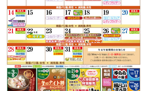 本格的な冬の寒さが訪れる12月。冷えは万病のもと。しっかり温めて一年を元気に締めくくりましょう! ■水・木曜日は21時以降のご入浴が安い! 21時からラストまで、ご入浴料金が600円週の半ばに癒しの時間をどうぞ。 ※スタ … 続きを読む ゆららの湯押熊店 12月イベントのお知らせ