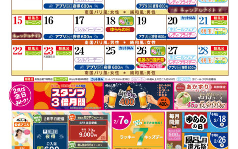 大寒を過ぎ少しずつ日も長くなってきましたが、朝晩は冷え込む日が続いていますね。こんな季節にこそあたたかい温泉でほっとひと息つく時間がおすすめです。天然温泉が冷えた手足の先まで包み込み、お身体はもちろん心もきっとあったまり … 続きを読む ゆららの湯押熊店 2月イベントのお知らせ