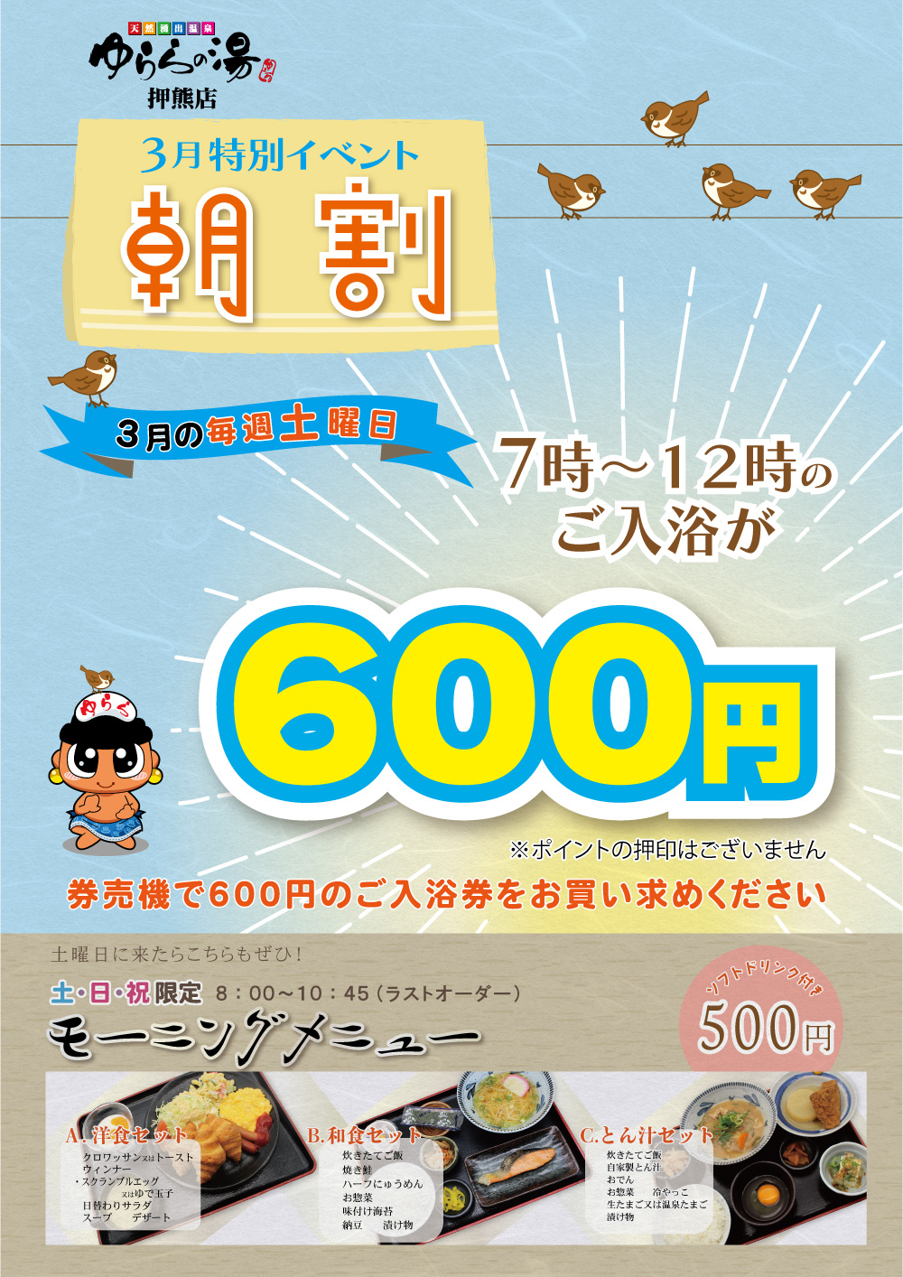 朝7時~お昼12時までのご入浴が今だけ600円。