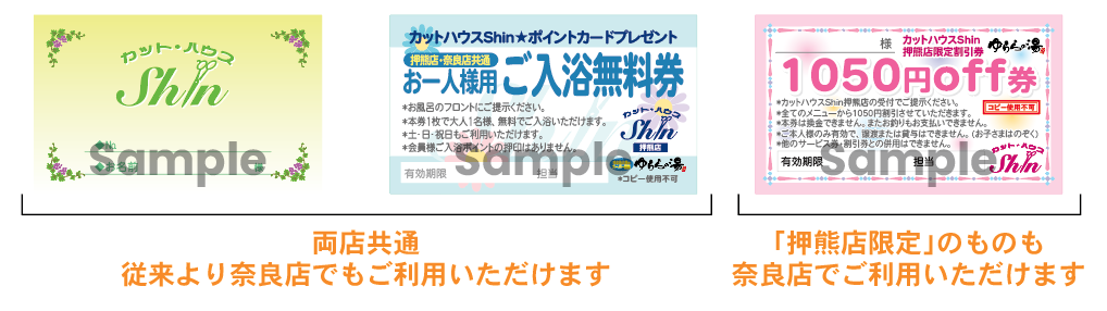 カットハウスShinのポイントカードおよび各種特典チケットにつきましては、引き続き有効期限までカットハウスShin奈良店にてご利用いただけます。