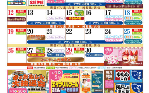4月は出会いの季節。新しい学校、クラス、職場で新たな生活と向き合う方もおられるのではないでしょうか。ワクワクは胸に溜めて、ストレスは温泉に溶かして、元気な春をお過ごしください。 豪華景品が当たる! 春のお楽しみ大抽選会! … 続きを読む ゆららの湯押熊店 4月イベントのお知らせ